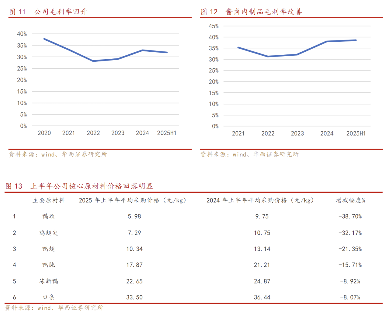 成本红利持续,盈利弹性释放:公司主营的酱卤业务成本结构中原材料占比高。2025年上半年,鸭脖、鸭翅等核心原材料采购价同比大幅下降,其中鸭颈降幅达-38.70%。成本端的改善直接推动了盈利能力提升,2025年上半年酱卤肉制品毛利率同比提升2.23个百分点,前三季度归母净利润在营收微降的情况下同比增长28.59%。在原材料价格维持低位的预期下,叠加公司费用控制,盈利弹性有望持续释放。