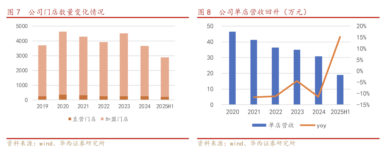 千城万店”战略优化,提升门店质量:面对行业竞争,公司正从过去的规模扩张转向存量门店的精细化运营和质量提升。2025年上半年公司门店总数从年初的3600多家收缩至2898家,主动关闭低效门店。未来拓店将侧重于老市场深耕和高势能点位(如机场、高铁、大型商超)的开发。这种“关低效、开优质”的策略,短期虽影响收入规模,但长期有利于提升单店盈利能力和整体网络的健康度。