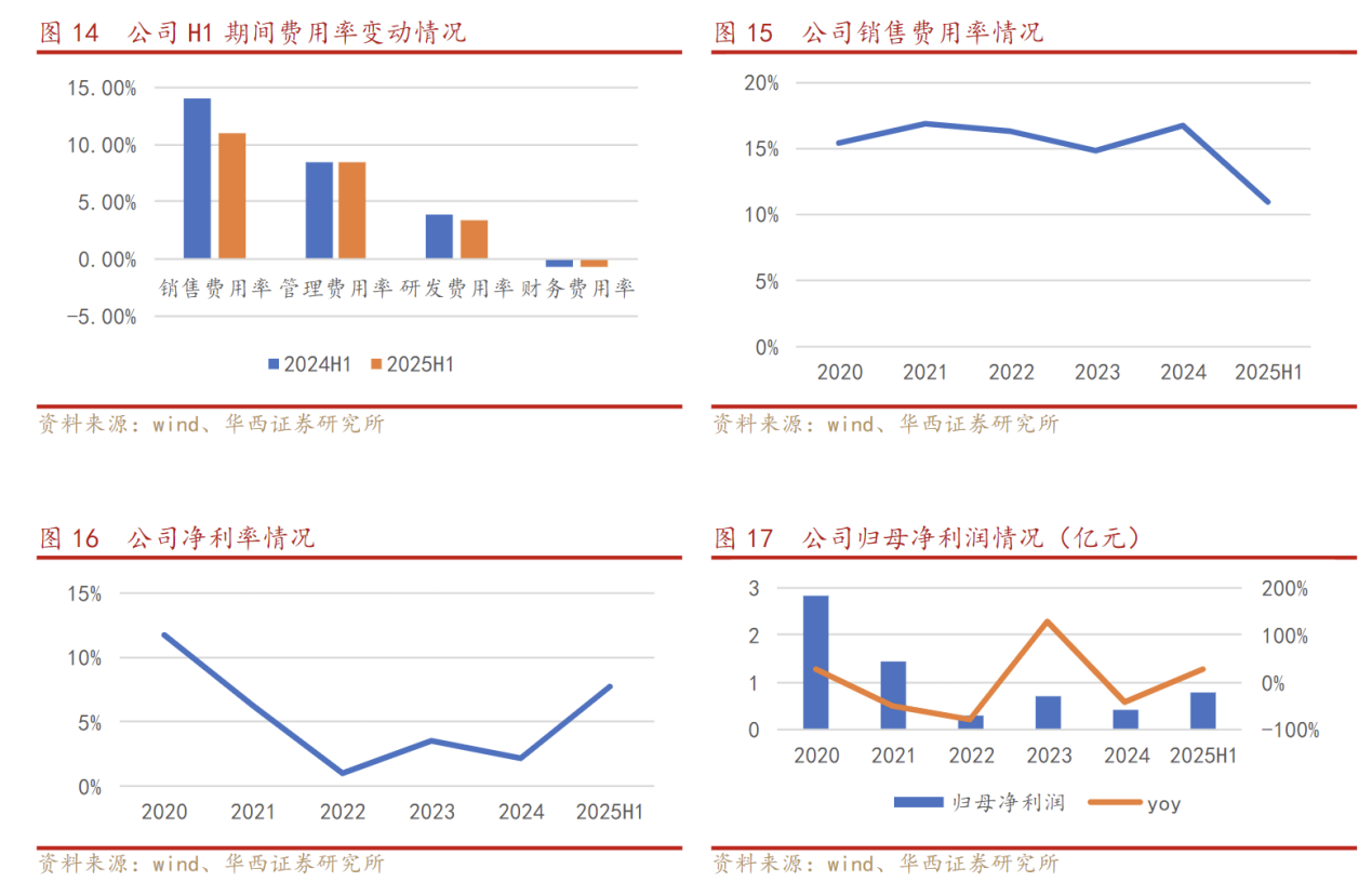 Q3营收同比转正,利润延续高增趋势。2025Q3公司实现营收3.94亿元(yoy+0.62%),实现归母净利润0.24亿元(yoy+34.31%)。Q3利润增长延续上半年高增趋势,营收同比转正,终结连续6个季度营收同比下滑趋势。2025Q3公司销售/管理/研发/财务费用率分别为14.04%/10.29%/2.94%/-0.49%,分别同比下滑4.64/0.72/0.25/0.18pct;毛利率/归母净利率分别为35.65%/6.11%,分别同比-1.27/+1.53pct。在当前消费环境与行业竞争下,公司主营业务逐步改善,并通过有效成本费用管控,盈利能力有所修复。