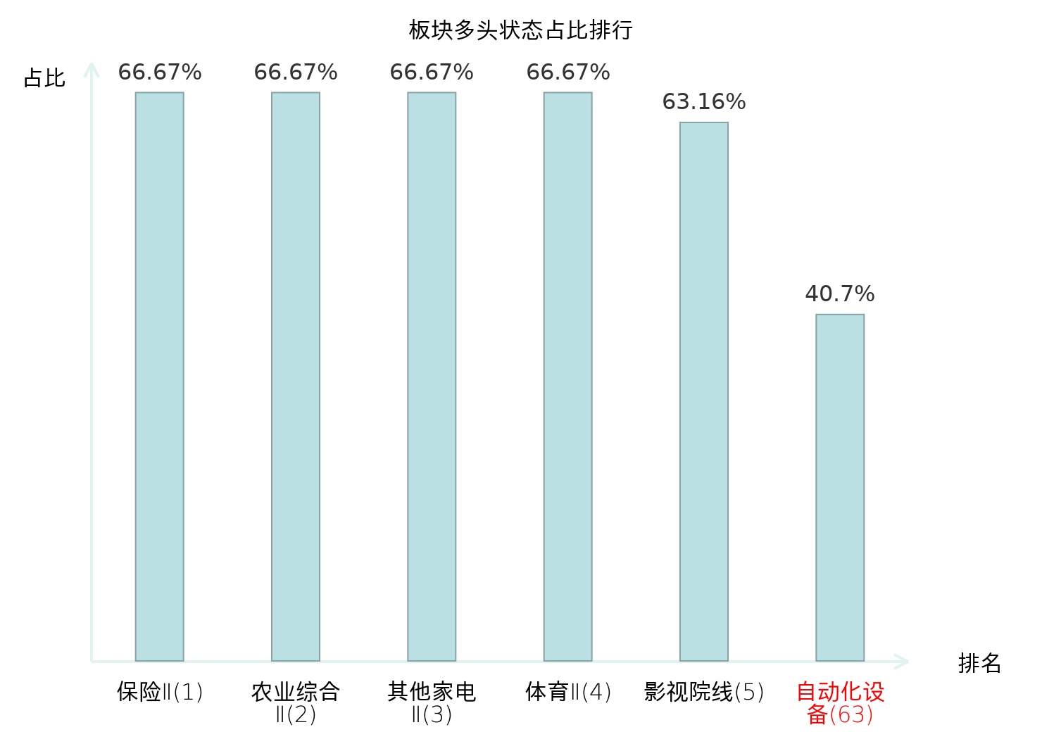 全市场所有行业板块中主力多头状态占比排名中,保险Ⅱ板块位居第一。冶钢原料板块名次提升最快,较昨日上升53位。