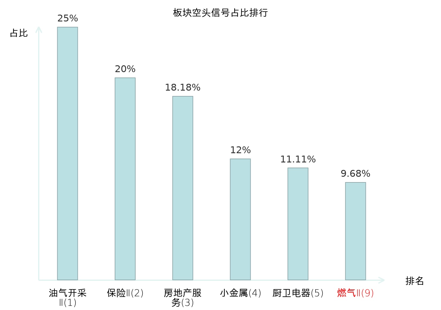 全市场所有行业板块中主力空头信号占比排名中,油气开采Ⅱ板块位居第一。装修建材板块名次提升最快,较昨日上升117位。