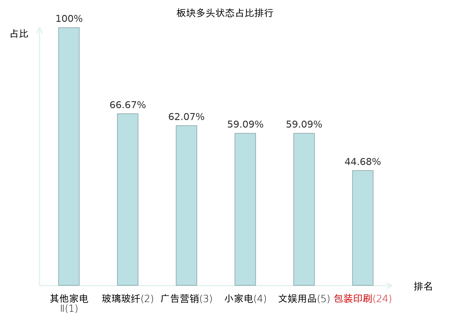 全市场所有行业板块中主力多头状态占比排名中,其他家电Ⅱ板块位居第一。消费电子板块名次提升最快,较昨日上升54位。