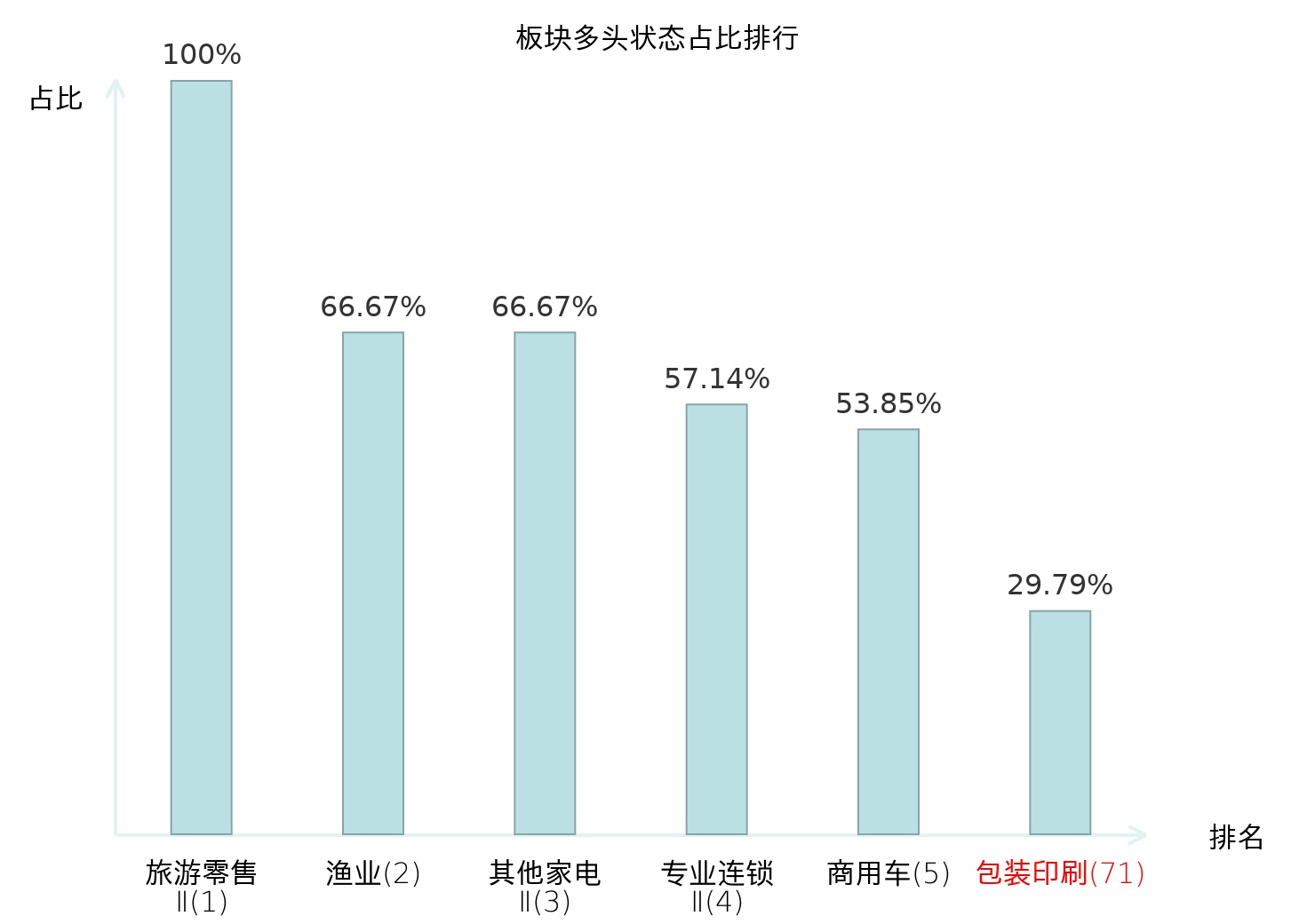 全市场所有行业板块中主力多头状态占比排名中,旅游零售Ⅱ板块位居第一。农产品加工板块名次提升最快,较昨日上升46位。