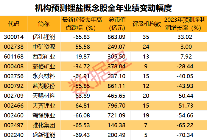对于今年全年业绩预期,在至少获得5家机构评级的概念股中,仅亿纬锂能的机构一致预测净利润增长率为正,机构一致预测该股今年归母净利润增长33.02%。天赐材料、天齐锂业、赣锋锂业、雅化集团、盛新锂能的机构预测2023年净利润均下滑超50%。