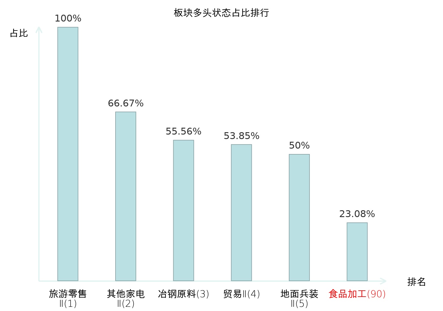 全市场所有行业板块中主力多头状态占比排名中,旅游零售Ⅱ板块位居第一。房屋建设Ⅱ板块名次提升最快,较昨日上升58位。