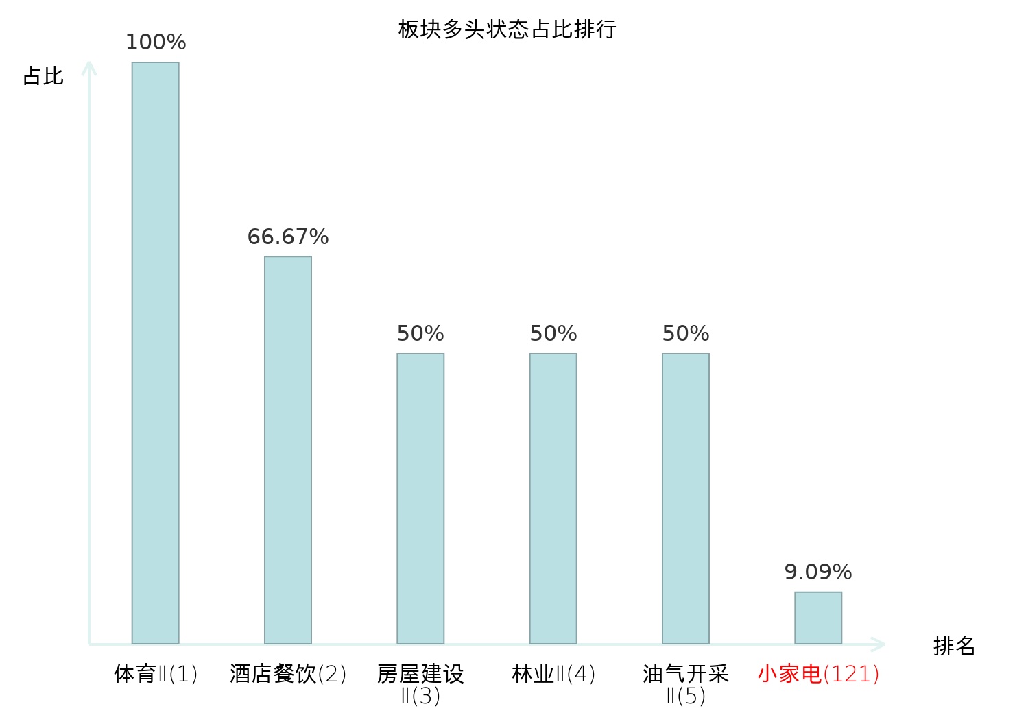 全市场所有行业板块中主力多头状态占比排名中,体育Ⅱ板块位居第一。国有大型银行Ⅱ板块名次提升最快,较昨日上升100位。