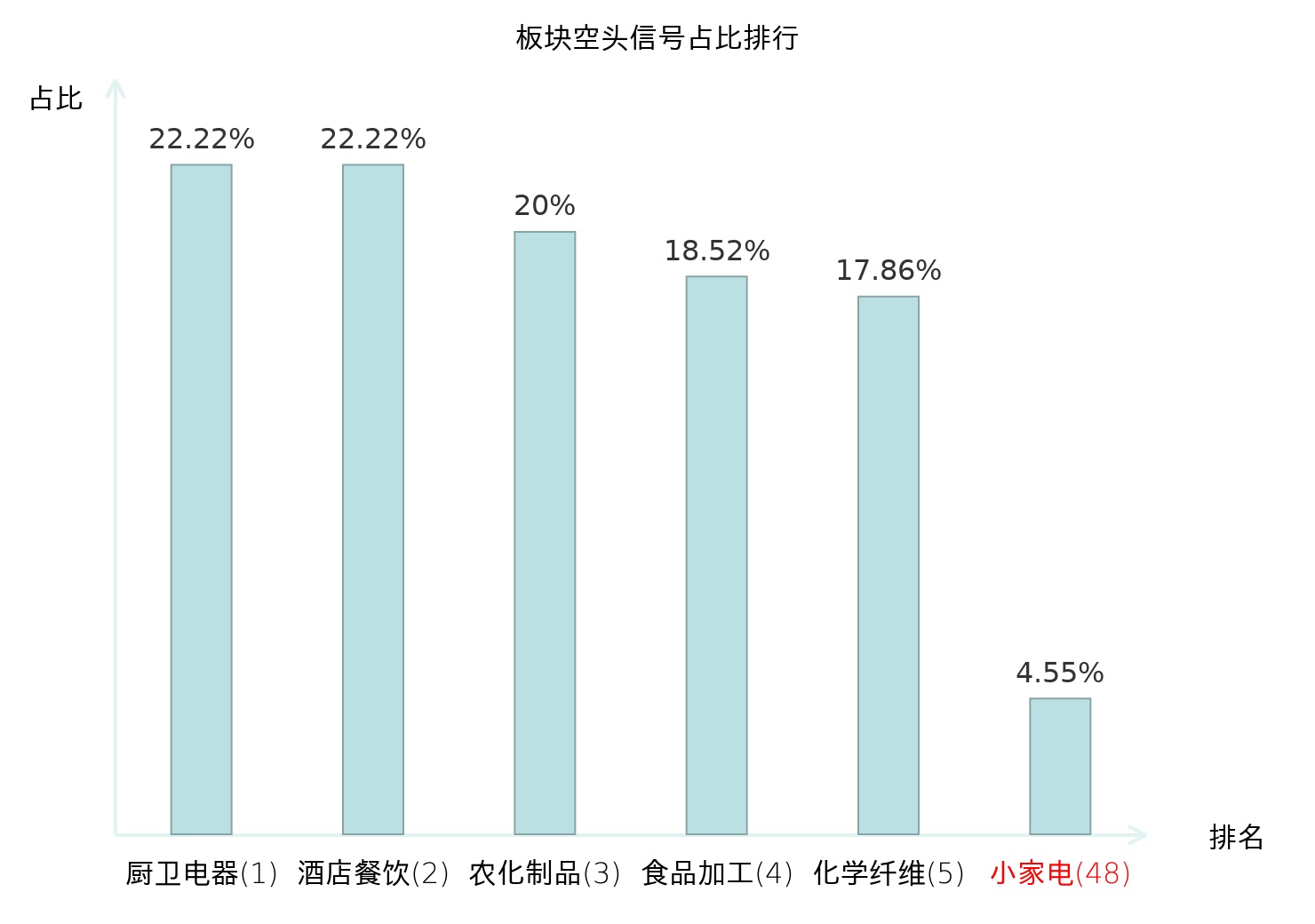 全市场所有行业板块中主力空头信号占比排名中,厨卫电器板块位居第一。化学纤维板块名次提升最快,较昨日上升119位。