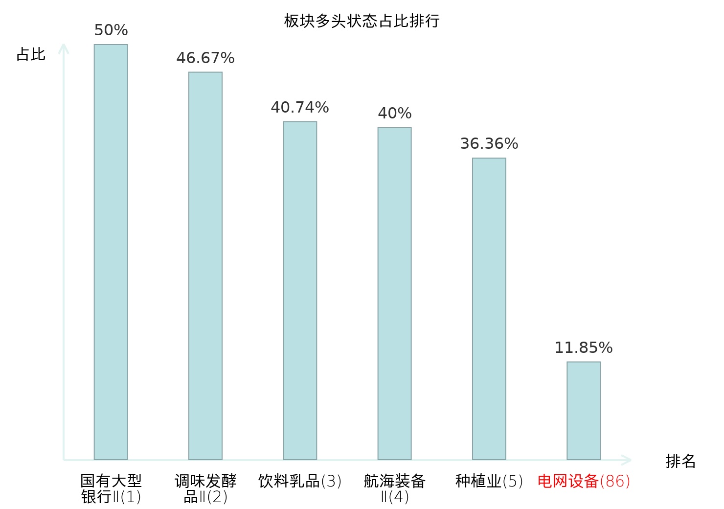 全市场所有行业板块中主力多头状态占比排名中,国有大型银行Ⅱ板块位居第一。金属新材料板块名次提升最快,较昨日上升71位。