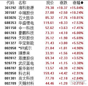 截至发稿,海科新源涨超15%,中瑞股份涨超10%,石大胜华强势涨停;宁德时代、天赐材料、璞泰来、恩捷股份、华盛锂电、中一科技、豪鹏科技、天际股份等集体走高。