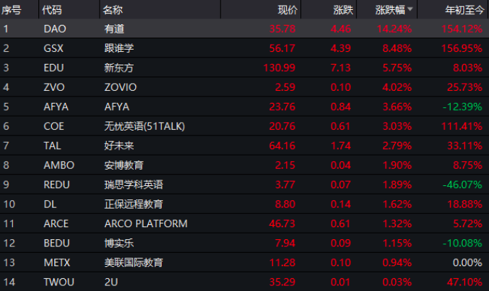 美股方面,教育相关个股昨夜盘前也呈现上扬行情。截至收盘,有道股价涨14.24%,跟谁学、新东方股价涨5%以上,无忧英语(51TALK)、好未来均有不同幅度上涨。