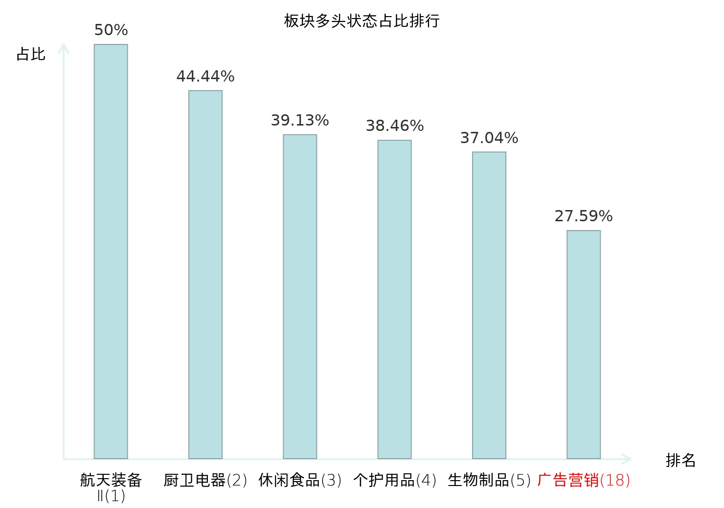 全市场所有行业板块中主力多头状态占比排名中,航天装备Ⅱ板块位居第一。小金属板块名次提升最快,较昨日上升53位。