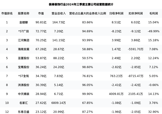 东易日盛最新报告期数据为三季度,下表汇总了装修装饰行业内市值靠前的公司三季度主要经营数据