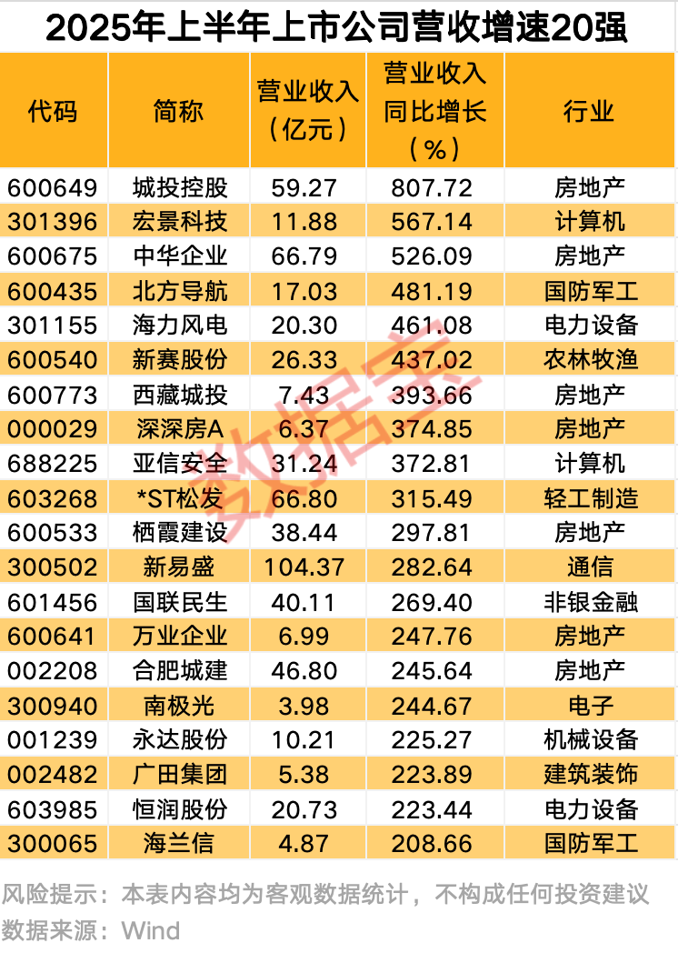 据数据宝统计,筛选2024年上半年营业收入超1亿元的上市公司后,62家上市公司营业收入在2025年上半年实现翻倍增长,其中城投控股、宏景科技、中华企业增幅超过500%。