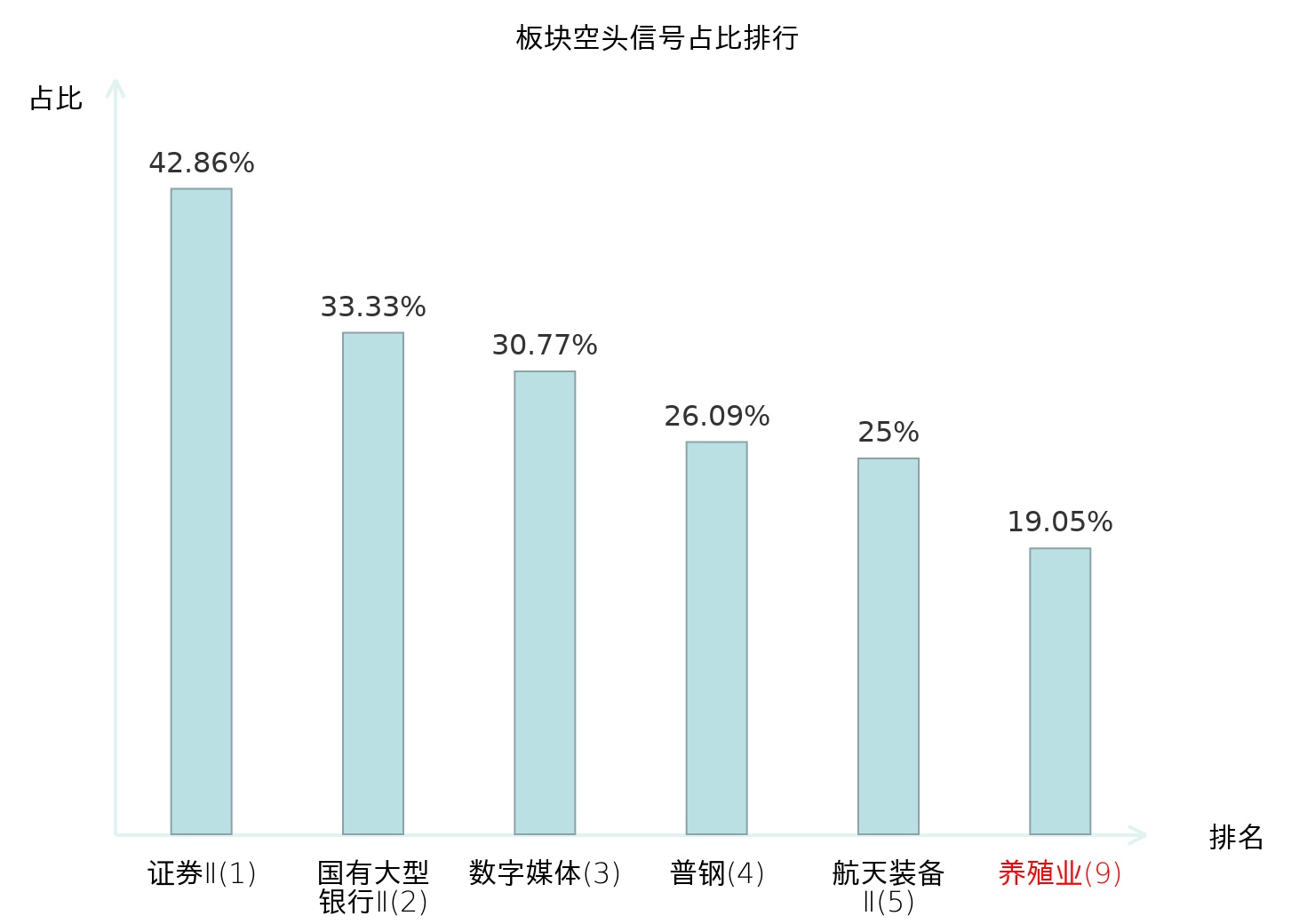 全市场所有行业板块中主力空头信号占比排名中,证券Ⅱ板块位居第一。证券Ⅱ板块名次提升最快,较昨日上升127位。
