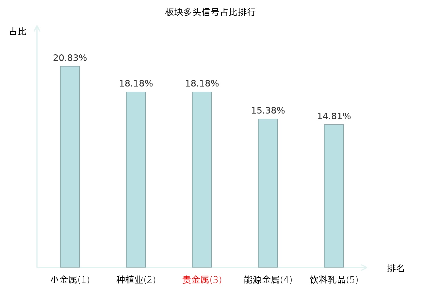 全市场所有行业板块中主力多头信号占比排名中,小金属板块位居第一。房屋建设Ⅱ板块名次提升最快,较昨日上升111位。