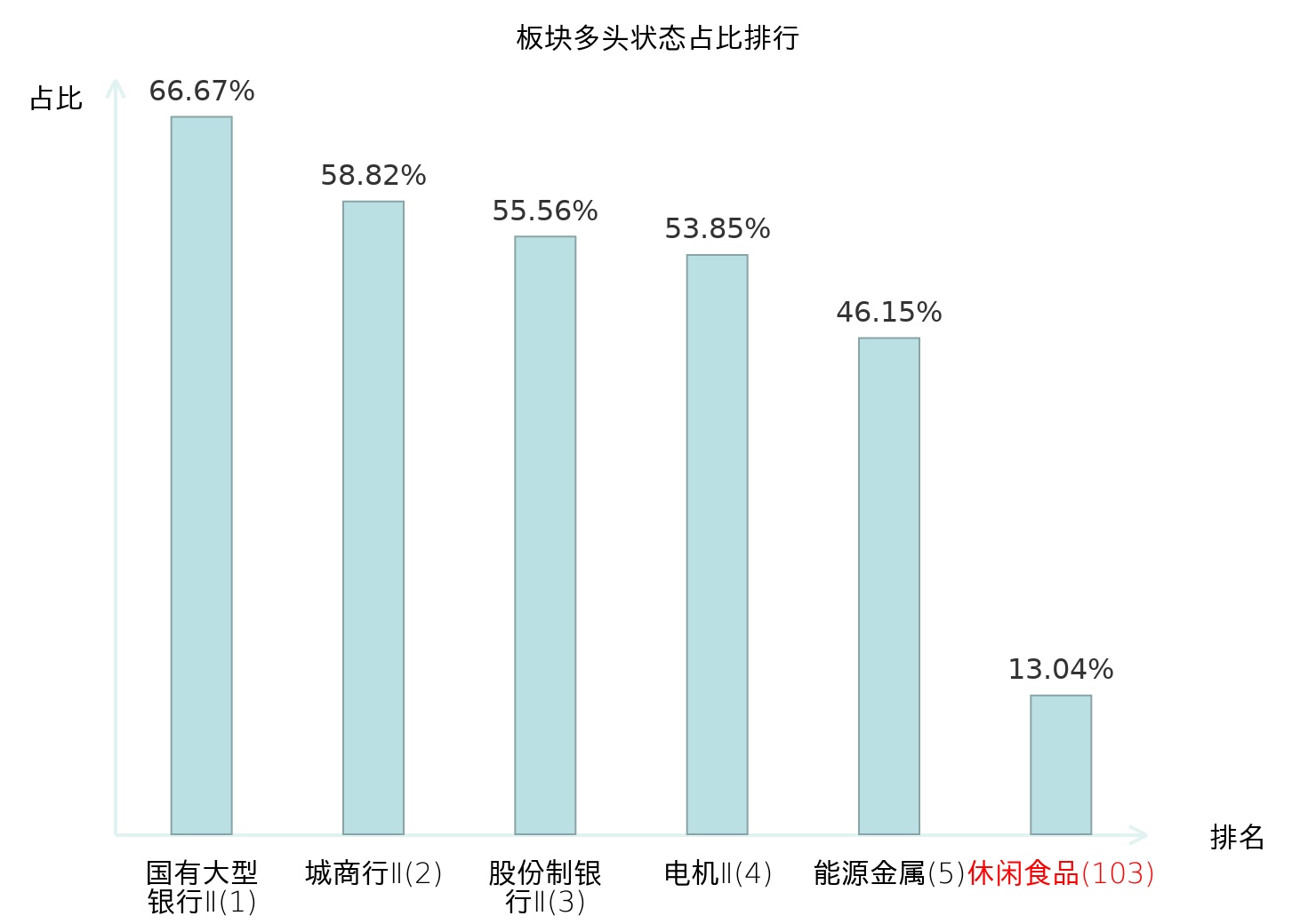 全市场所有行业板块中主力多头状态占比排名中,国有大型银行Ⅱ板块位居第一。自动化设备板块名次提升最快,较昨日上升57位。
