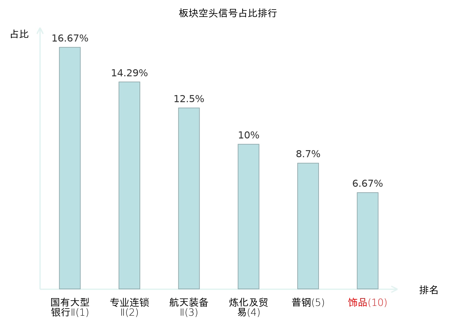 全市场所有行业板块中主力空头信号占比排名中,国有大型银行Ⅱ板块位居第一。食品加工板块名次提升最快,较昨日上升103位。