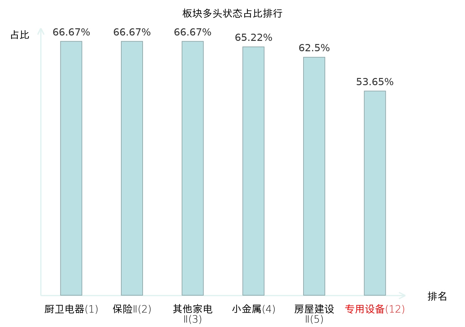 全市场所有行业板块中主力多头状态占比排名中,厨卫电器板块位居第一。乘用车板块名次提升最快,较昨日上升82位。