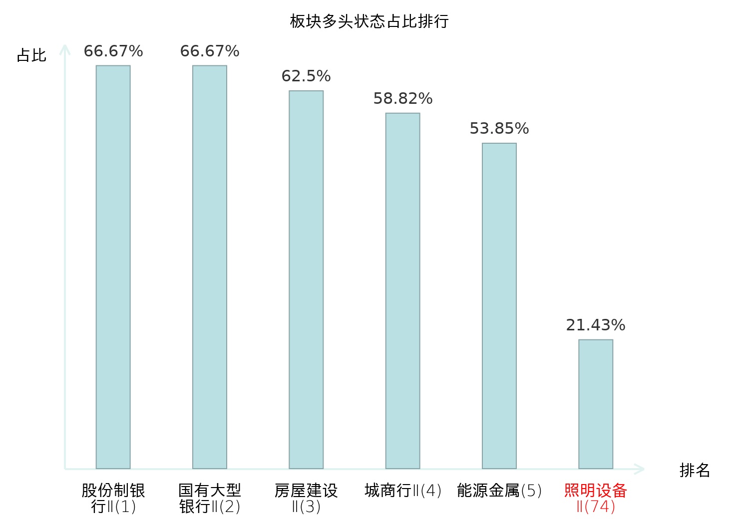 全市场所有行业板块中主力多头状态占比排名中,股份制银行Ⅱ板块位居第一。航空机场板块名次提升最快,较昨日上升68位。