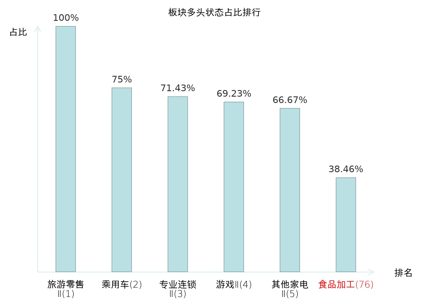 全市场所有行业板块中主力多头状态占比排名中,旅游零售Ⅱ板块位居第一。保险Ⅱ板块名次提升最快,较昨日上升82位。