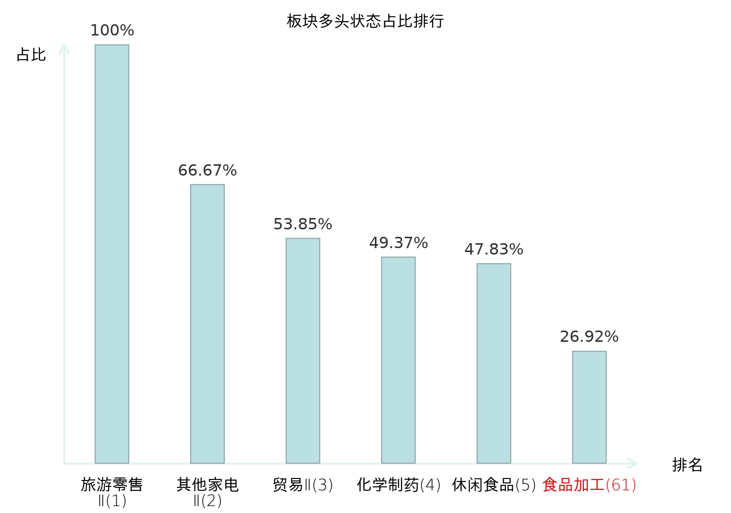 全市场所有行业板块中主力多头状态占比排名中,旅游零售Ⅱ板块位居第一。互联网电商板块名次提升最快,较昨日上升55位。