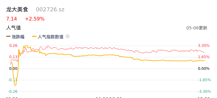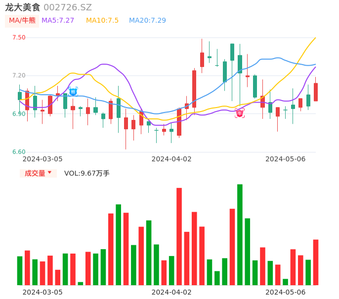 05月06日,龙大美食收报7.14,股价涨幅2.59%,成交金额6890.73万元,换手率0.90%。
