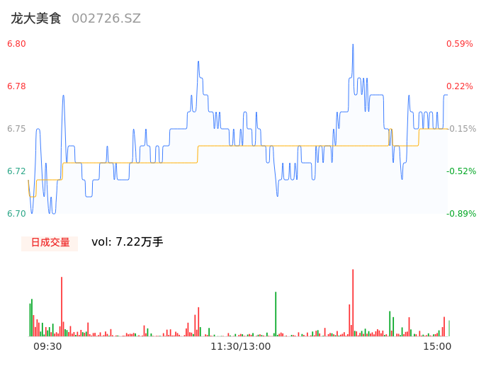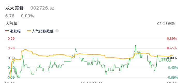 05月13日,龙大美食收报6.76,股价涨幅0.00%,成交金额4872.17万元,换手率0.67%。