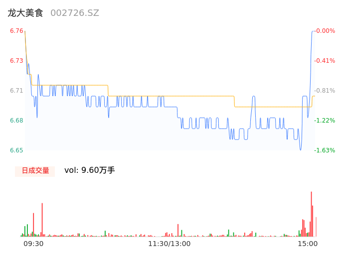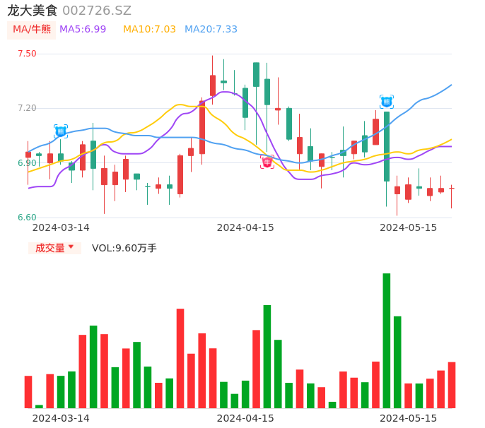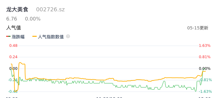 05月15日,龙大美食收报6.76,股价涨幅0.00%,成交金额6430.03万元,换手率0.89%。