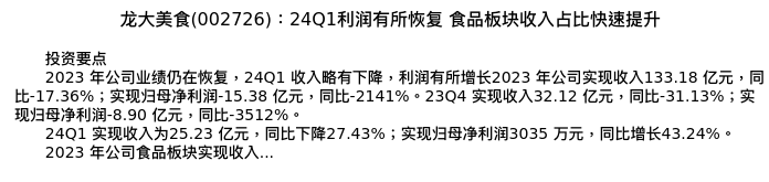 值得注意的是:2024年05月浙商证券的杨骥/杜宛泽分析师,首次发布关于龙大美食的研究报告,标题为:龙大美食(002726):24Q1利润有所恢复 食品板块收入占比快速提升。