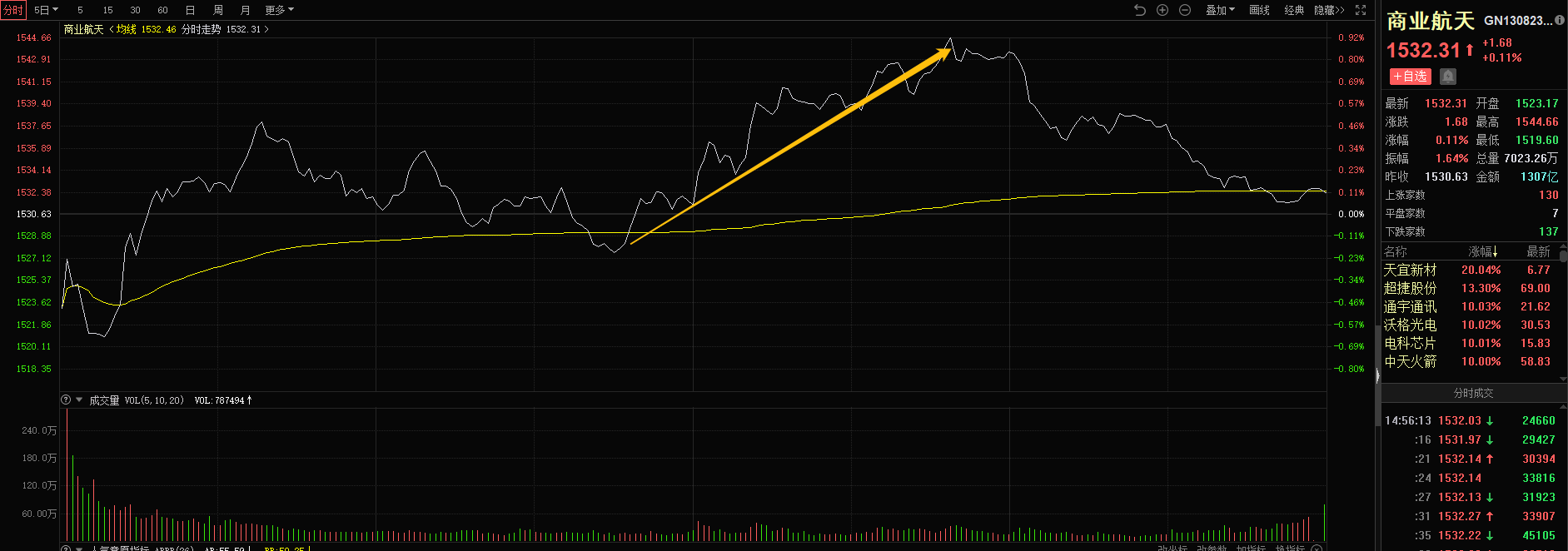 而商业航天,中午我们还在讲和低空经济,但是明显低空经济资金不太买账,反而是商业航天下午拉了起来,新增了天宜新材、中天火箭等涨停板,但是下午这波可以看到上涨不放量,所以涨了一个小时,也是回落居多,几乎抹去日内的涨幅。超捷股份和通宇通讯这种都是偏向趋势新高的,所以涨起来比下跌趋势的容易,商业航天本周反复表现,活跃度不错的,积极关注,选股上优先选上升右侧趋势的个股。