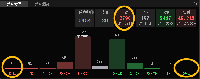 虽然今天指数表现不咋地,但至少个股比昨天强,个股涨超2700+,涨停63只,跌停14只,下午冲高回落,亏钱效应开始增加。
