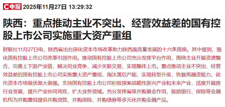 而陕西板块的下午的一波集体异动是消息刺激的上涨。陕西省出台了深化资本市场改革的十六夜措施,提到了一条有关国有控股公司重组措施利好的,消息一出量化立马抓取语料拉升了西安饮食西安旅游这两只曾经的跨年龙头股,其他陕西本地的个股也有不同程度的脉冲。而就从下午陕西本地股的反应看,没有一只封板成功,说明资金对这个消息的认可度也是比较一般的,毕竟炒地图的行情,之前就有先例、湖北、深圳、上海、重庆、福建、海南、但力度都比炒陕西的强,说明炒地图也不太受认可了,这也是资金相对谨慎的一个表现。