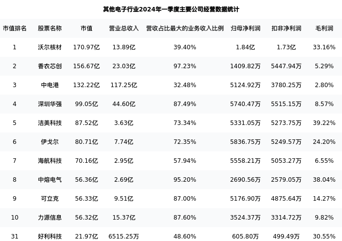 好利科技最新报告期数据为一季度,下表汇总了其他电子行业内市值靠前的公司一季度主要经营数据