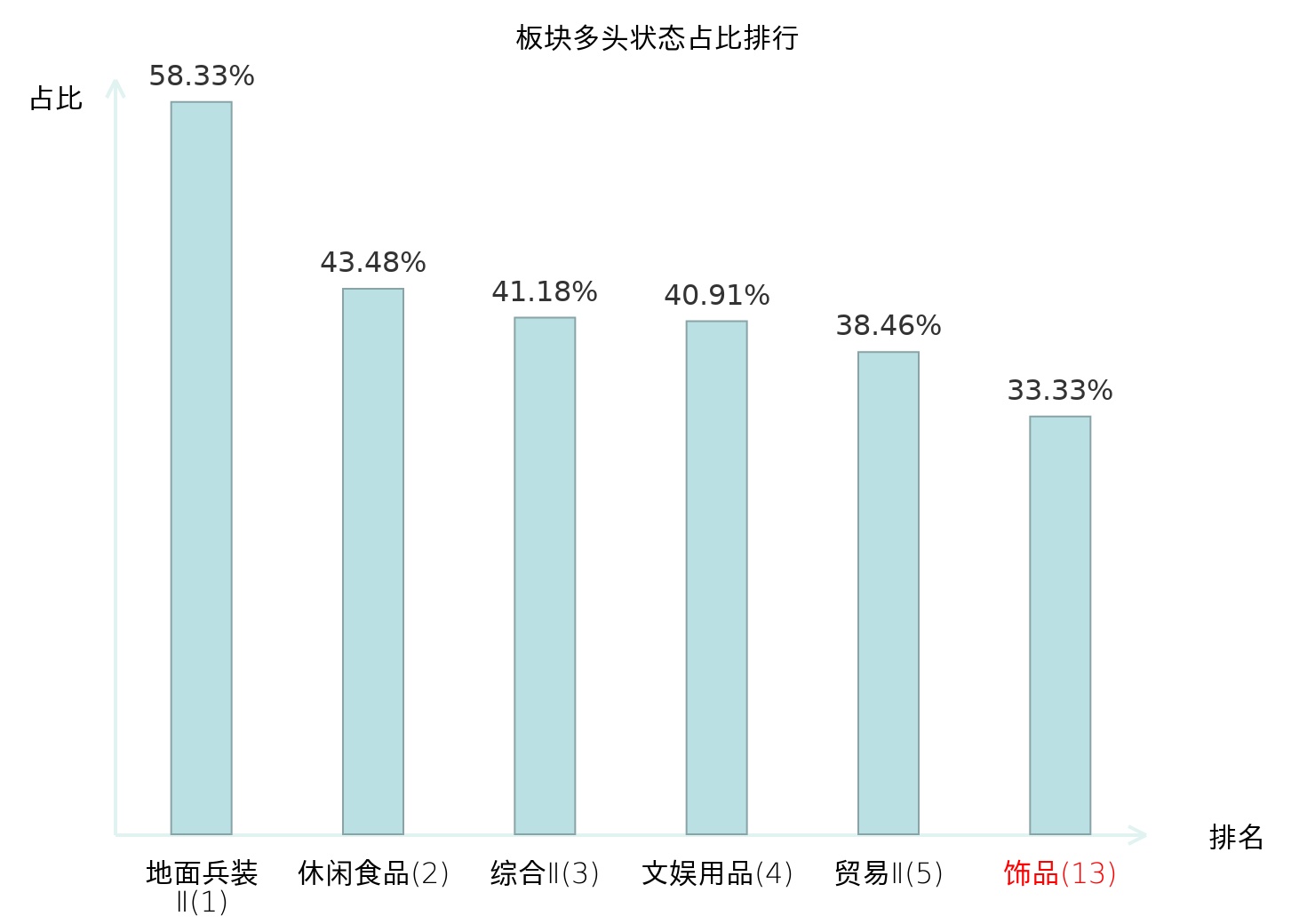 全市场所有行业板块中主力多头状态占比排名中,地面兵装Ⅱ板块位居第一。林业Ⅱ板块名次提升最快,较昨日上升90位。