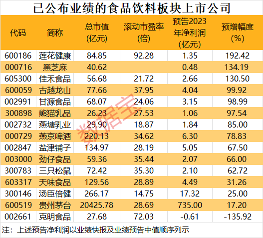 近日,多家食品饮料类上市公司披露了年报预告,超九成公司业绩预喜。以业绩预告净利润中值计算,莲花健康、黑芝麻、佳禾食品预计净利润实现翻倍,同比分别增长192.42%、134.19%、130.5%;此外,古越龙山、甘源食品、熊猫乳品、燕塘乳业业绩同样表现亮眼。
