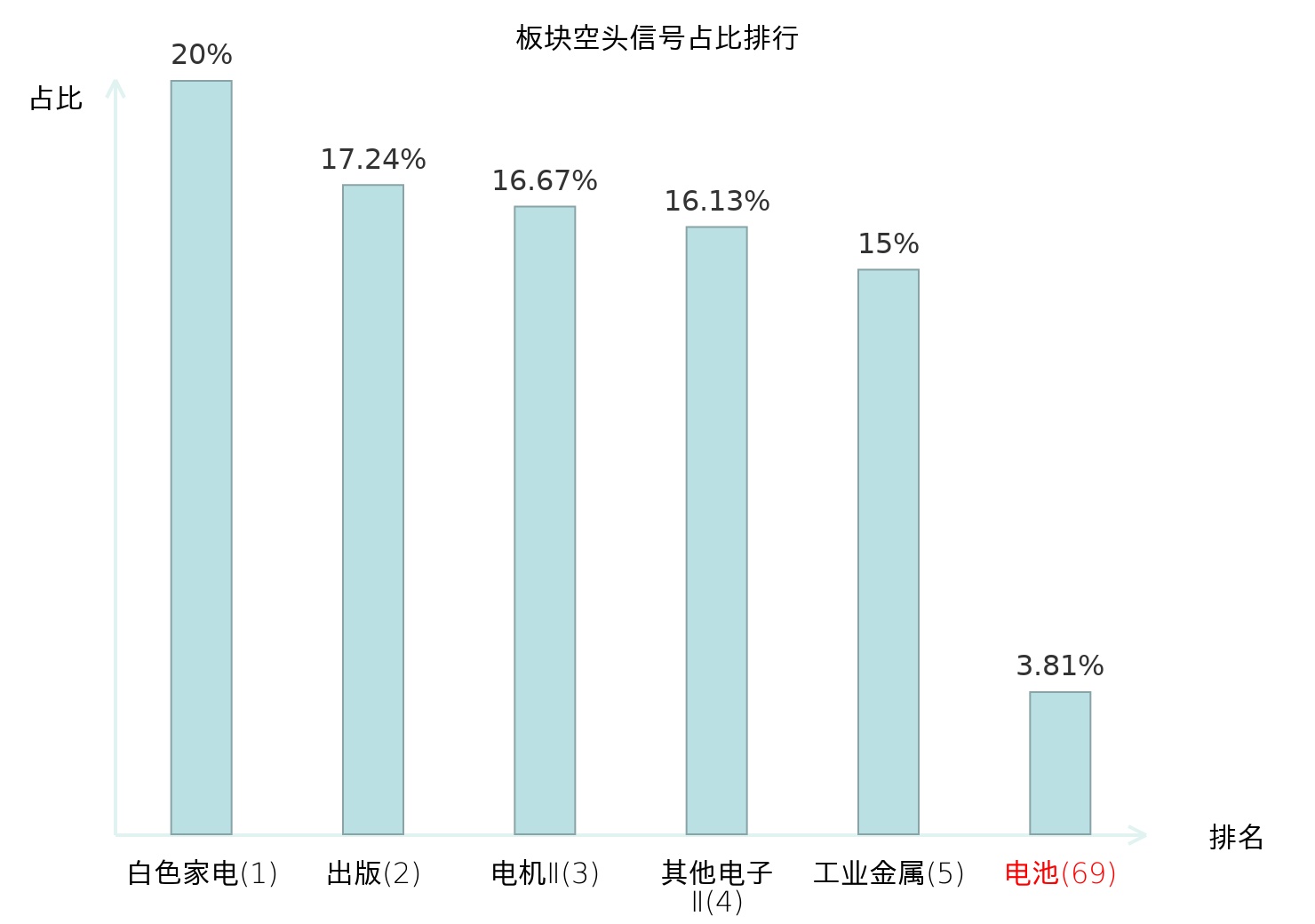 全市场所有行业板块中主力空头信号占比排名中,白色家电板块位居第一。其他电子Ⅱ板块名次提升最快,较昨日上升123位。