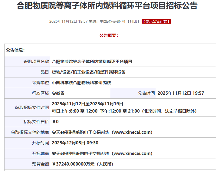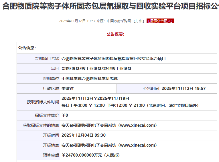 《科创板日报》11月13日讯(编辑 宋子乔) 11月12日,中国政府采购网公布,中国科学院下属合肥物质院等离子体所的四个项目招标,包括液态包层氚提取系统、内燃料循环平台、固态包层氚提取与回收实验平台、氚安全防护平台,预算金额分别为2.12亿元、3.724亿元、2.47亿元、5.14亿元,累计招标金额13.45亿元。