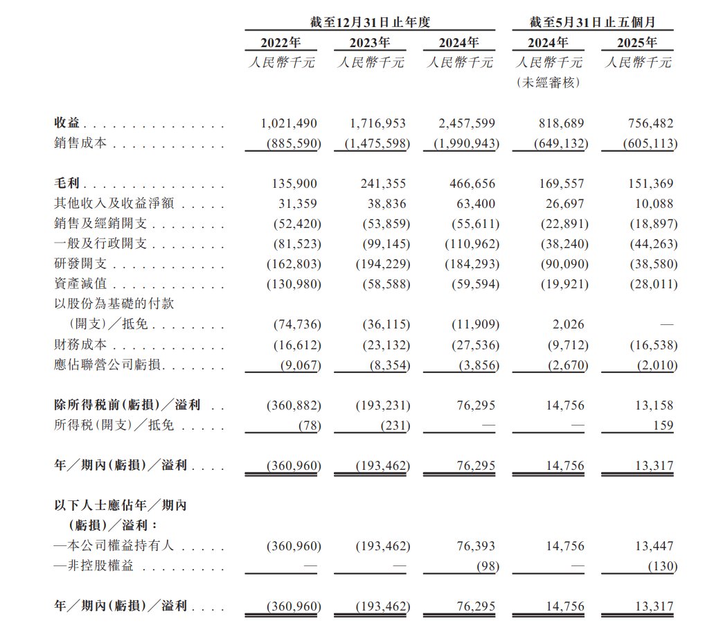 财务方面,于2022年度、2023年度、2024年度、2024年及2025年截至5月31日止五个月,飞骧科技实现收益分别约为10.21亿元、17.17亿元、24.58亿元、8.19亿元、7.56亿元人民币;同期,年/期内溢利分别约为-3.61亿元、-1.93亿元、7629.5万元、1475.6万元、1331.7万元人民币。