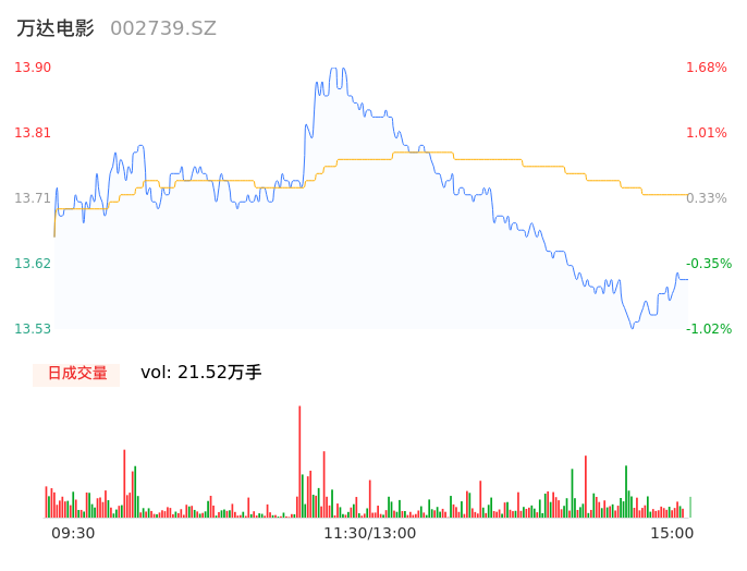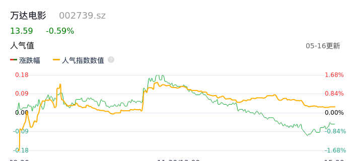 05月16日,万达电影收报13.59,股价涨幅-0.59%,成交金额2.95亿元,换手率1.02%。