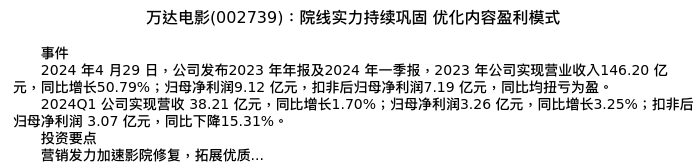 值得注意的是:2024年05月中邮证券的王晓萱/刘静茹分析师,首次发布关于万达电影的研究报告,标题为:万达电影(002739):院线实力持续巩固 优化内容盈利模式。
