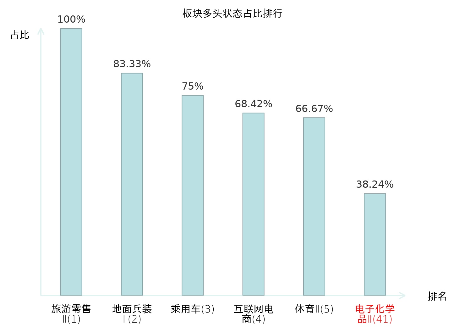 全市场所有行业板块中主力多头状态占比排名中,旅游零售Ⅱ板块位居第一。房屋建设Ⅱ板块名次提升最快,较昨日上升50位。