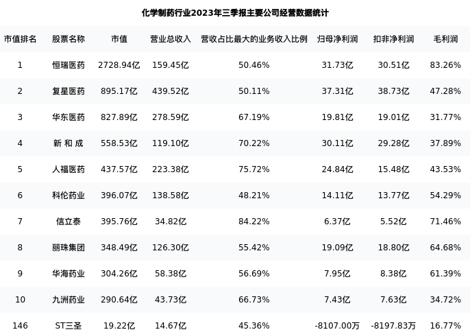 ST三圣最新报告期数据为三季报,下表汇总了化学制药行业内市值靠前的公司三季报主要经营数据