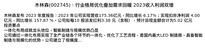 值得注意的是:2024年04月华鑫证券的吕卓阳/毛正分析师,首次发布关于木林森的研究报告,标题为:木林森(002745):行业格局优化叠加需求回暖 2023收入利润双增。