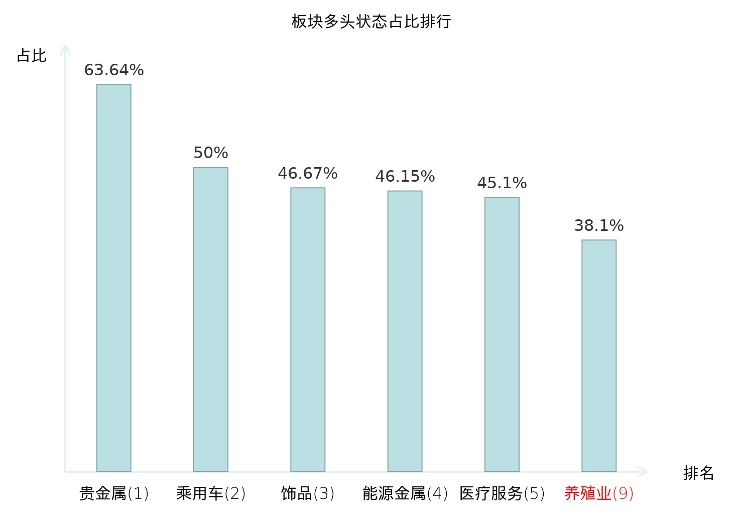 全市场所有行业板块中主力多头状态占比排名中,贵金属板块位居第一。电机Ⅱ板块名次提升最快,较昨日上升61位。