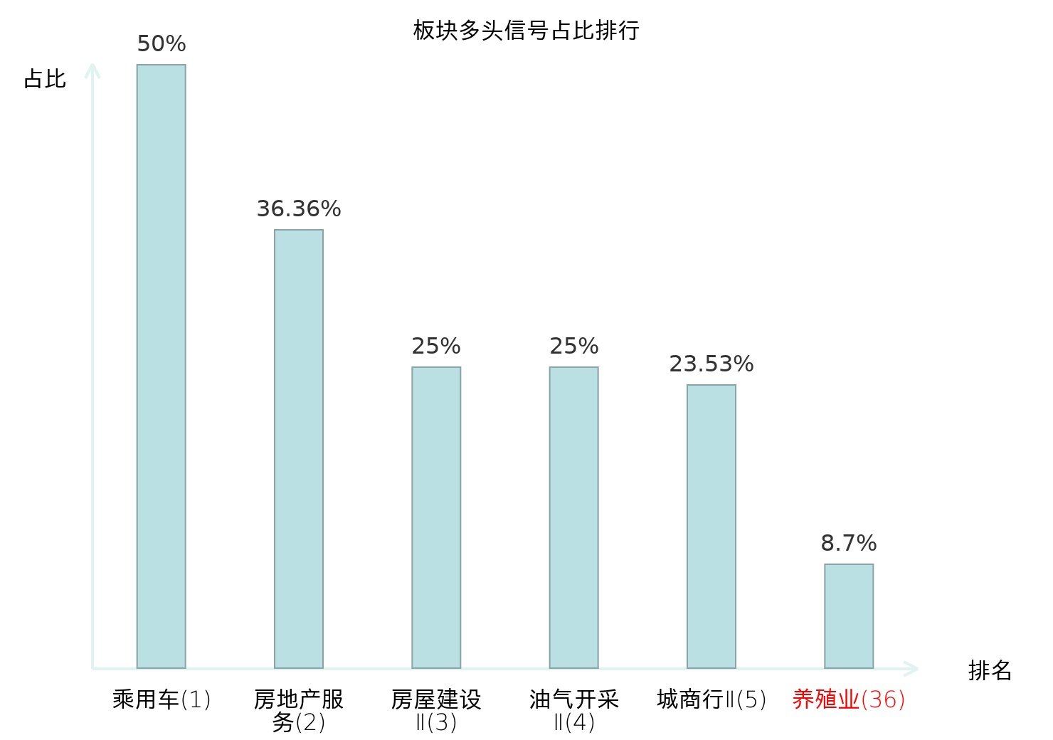 全市场所有行业板块中主力多头信号占比排名中,乘用车板块位居第一。油气开采Ⅱ板块名次提升最快,较昨日上升122位。