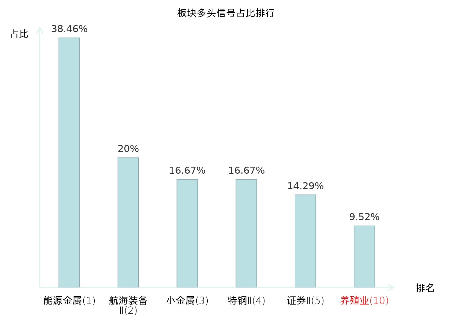 全市场所有行业板块中主力多头信号占比排名中,能源金属板块位居第一。航海装备Ⅱ板块名次提升最快,较昨日上升112位。