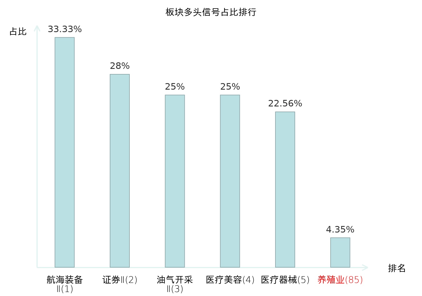 全市场所有行业板块中主力多头信号占比排名中,航海装备Ⅱ板块位居第一。油气开采Ⅱ板块名次提升最快,较昨日上升123位。