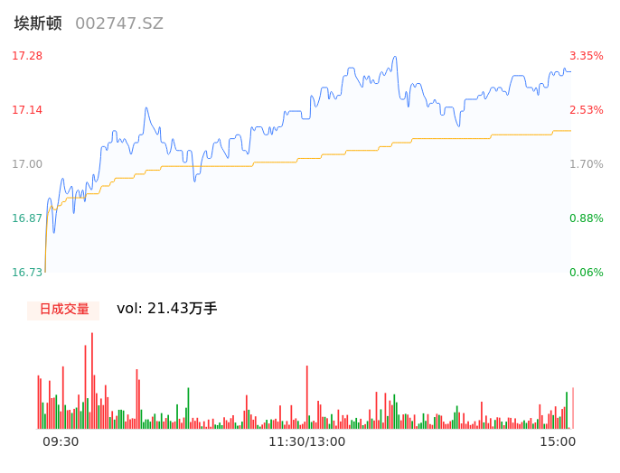04月26日,埃斯顿收报17.25,股价涨幅3.17%,成交金额3.66亿元,换手率2.72%。