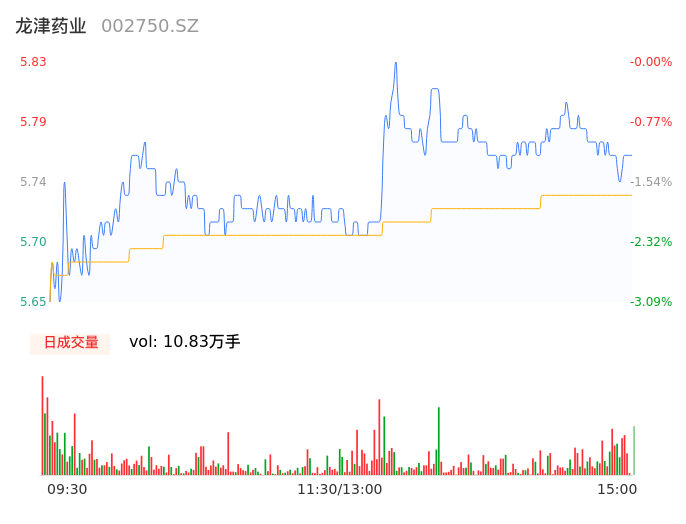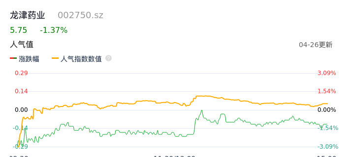 04月26日,龙津药业收报5.75,股价涨幅-1.37%,成交金额6205.89万元,换手率2.72%。