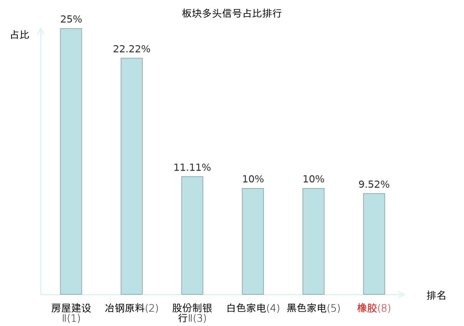 全市场所有行业板块中主力多头信号占比排名中,房屋建设Ⅱ板块位居第一。房屋建设Ⅱ板块名次提升最快,较昨日上升119位。